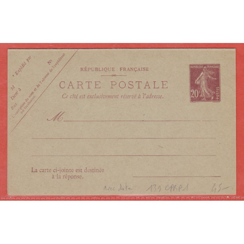 France Entier postal 139 CPRP1 avec date Type Semeuse camée