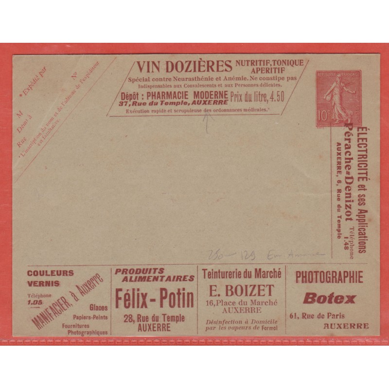 France Entier postal 129 Enveloppe annonce Auxerre Type Semeuse lignée