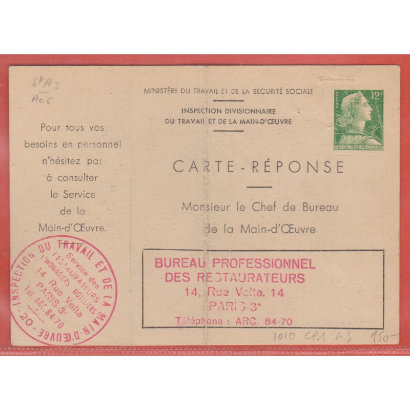 FRANCE ENTIER POSTAL 1010 CP1 A3a TYPE MULLER (pli)